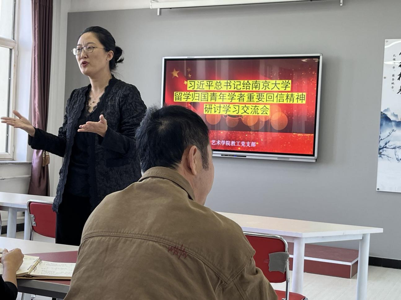 黑龙江财经学院艺术学院教工党支部组织全体教师和辅导员2022年9月21日集中学习关于习近平总书记给南京大学的留学归国青年学者回信,在学院各部门引发热烈反响,在艺术学院全体教师和辅导员心中引起强烈共鸣,为艺术学院各位专业教师、辅导员投身报国事业坚定了信心和决心,注入了强大动力。我们要深刻领会和把握习近平总书记重要回信精神的重大意义、丰富内涵、实践要求,紧密联系实际,用心思考体悟,坚决贯彻落实。