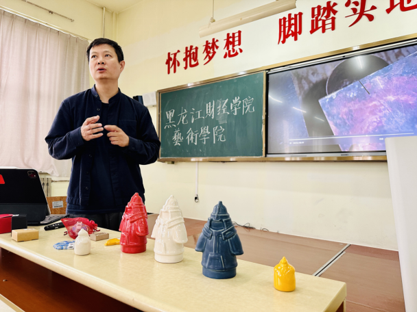 6月7日下午,艺术学院开展经纬讲坛活动,邀请黑龙江省陶瓷艺术大师、哈师大雕塑系陶艺主任王洋教授作关于女真文化与地域创意陶瓷研发与发展的专题讲座。本场讲座由王巍副院长、美育主任高鹏主持,参加讲座的还有艺术学院骨干教师及相关专业的学生。