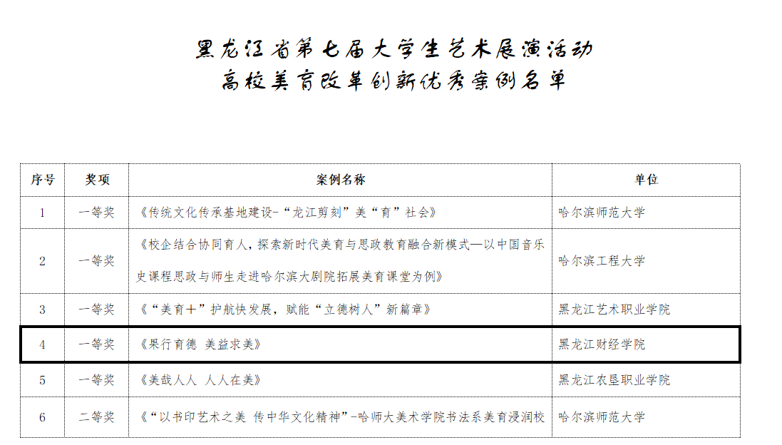 艺术学院提交的《果行育德美益求美——黑龙江财经学院美学美育系列课程建设与推进模式案例》,荣获黑龙江省第七届大学生艺术展演活动高校美育改革创新优秀案例一等奖。
