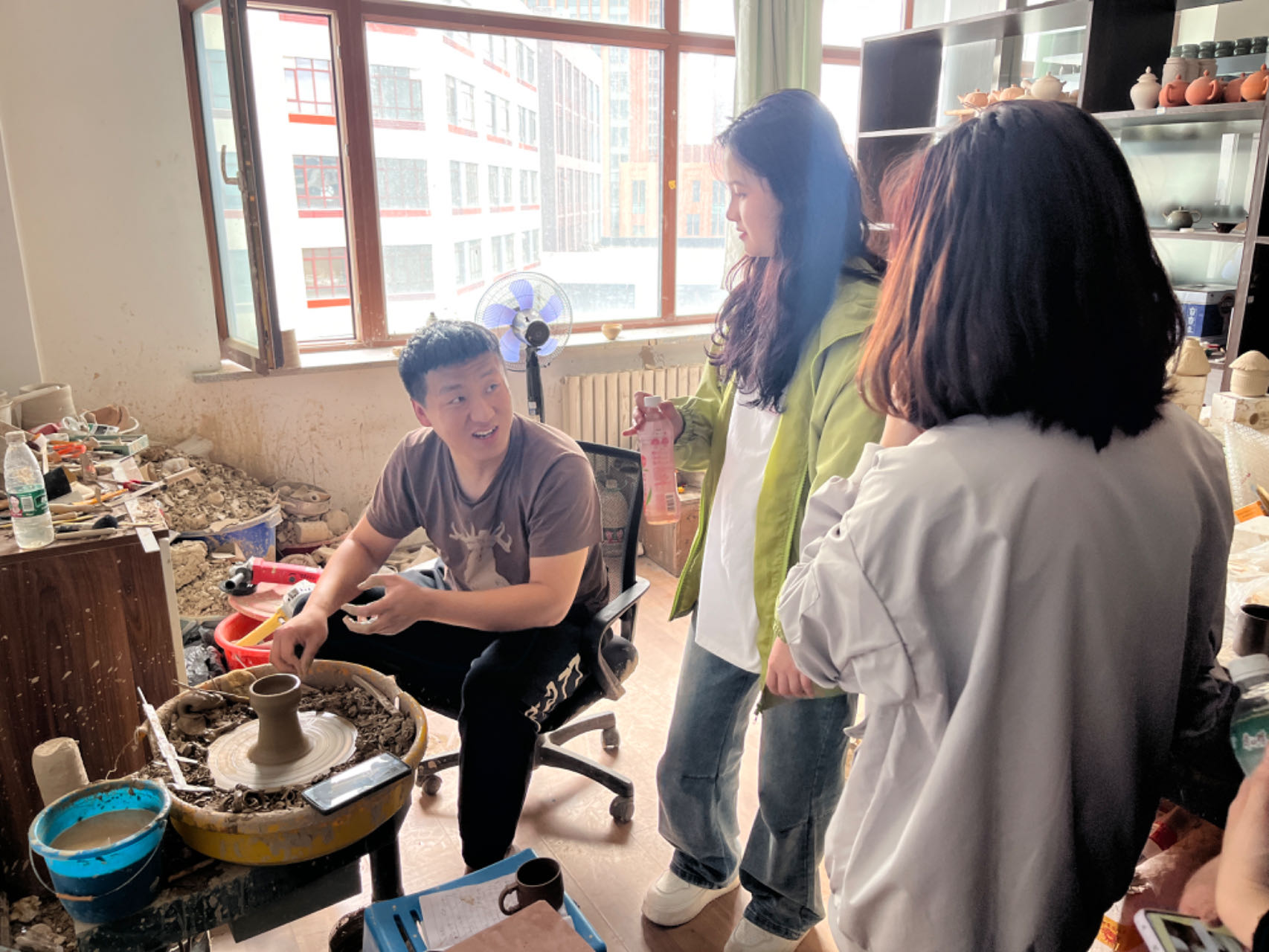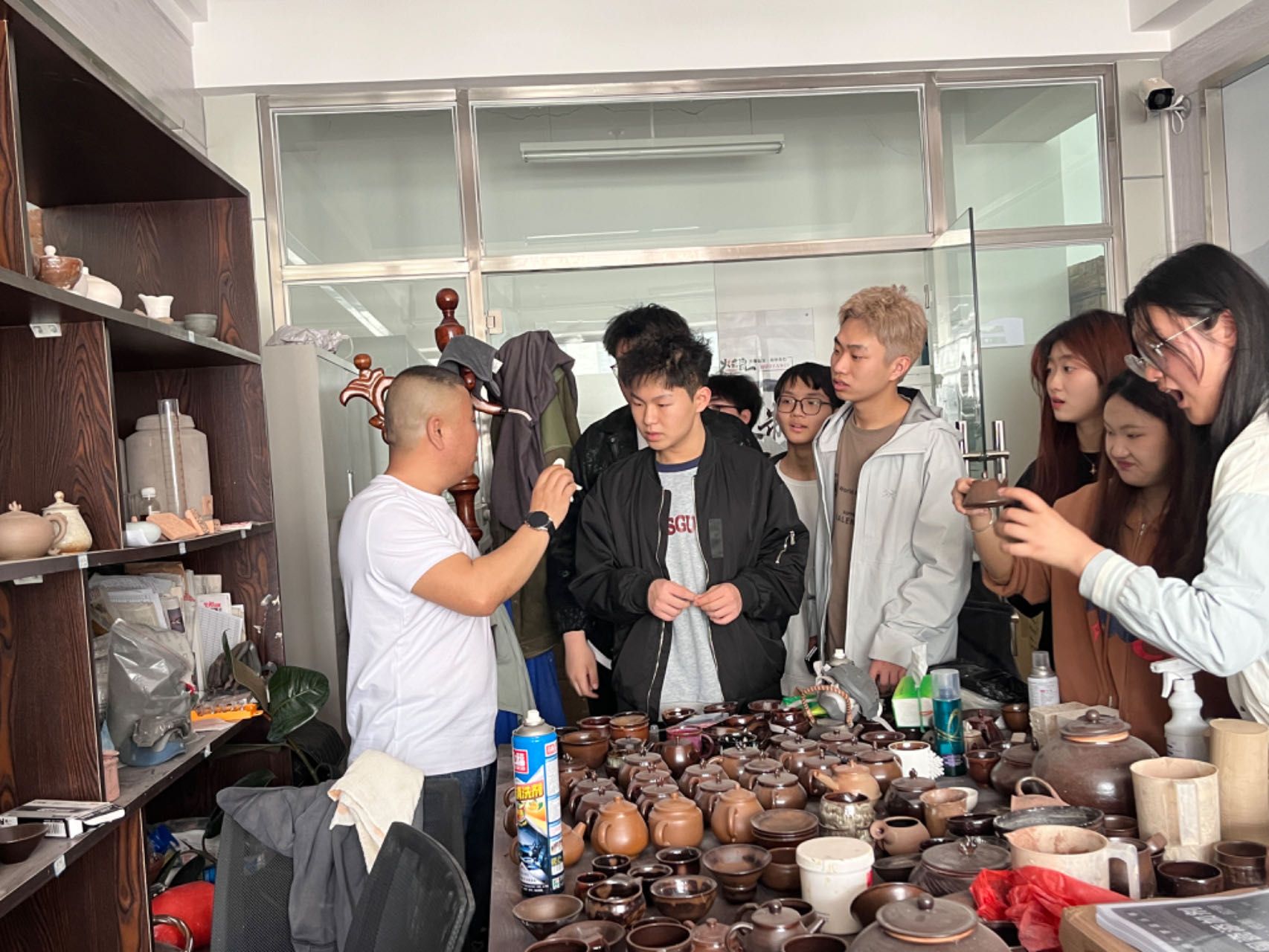 在宫国辉总经理的引导下,师生们参观了陈列着各式各样的火山瓷制品及其文创衍生品的产品展示区。宫总详细介绍了火山瓷的材质特点、工艺流程以及市场应用前景。