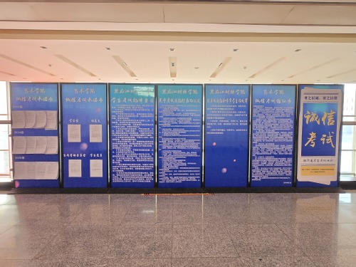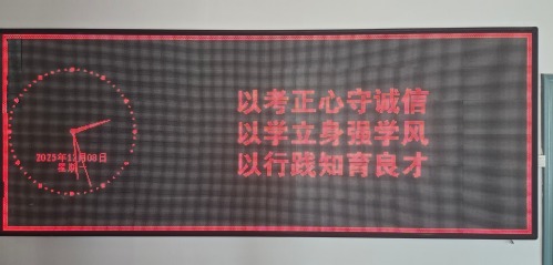 为强化教育效果,学院同步开展全方位氛围营造工作。尚学楼的LED屏24小时循环滚动“诚信立身,考试正心”“以考正心,以信立身”等主题标语,在尚学楼走廊张贴由学生自主设计的诚信考试主题海报和条幅,将诚信教育融入校园生活的各个场景。